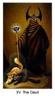 The image which emerged in the mid-1700’s gives us a more sophisticated rendition — that of the “scapegoated Goddess,” whose esoteric name is Baphomet. Volcanic reserves of passion and primal desire empower her efforts to overcome the pressure of stereotyped roles and experience true freedom of soul. Tavaglione’s highly evolved image (Stella deck) portrays the magical formula for harnessing and transmuting primal and obsessive emotions into a transformative energies. As a part of the Gnostic message of Tarot, this fearsome passion and power must be reintegrated into the personality, to fuel the soul’s passage from mortal to immortal.