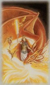 The Queen of Swords is a mature woman who walks through a pit of fire with confidence. Although the flames flare around her on all sides, her face is calm, her eyes straight ahead. She has learned that life offers both positive and negative learning experiences and that one becomes stronger by refusing to give in to fear an despair. In one hand she carries a raised sword, while the other rests on the head of a Fire dragon who is mostly hidden behind her and from whose mouth issues more flames. The sword represents the Queen’s faith in her ability to fight her way through any adversity, while the huge dragon-companion symbolizes astral and spiritual teachers who are always beside us, not to impede our progress by making life to smooth, but to guide our steps through any “trial” to safety. The Queen wears a crown with a triangular-shaped, red stone in front, symbolic of her connectedness with both the Goddess and her own feminine power. Three little Fire dragons frolic in the flames, encouraging her to continue her path.