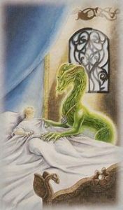 A large dragon tenderly administers healing and comfort to the man in the bed. Around his neck hangs a medallion with a triple spiral, symbol of life, death, and rebirth. As the man struggles with the mental and emotional agony that accompanies all cycles of renewal, the dragon looks on with love and understanding. The tracery on the window behind the dragon represents the Celtic Tree of Life, a symbol of the totality of all lives past, present, and future. The dragon’s spring-green color represents birth, a condition all humans must experience if they are to progress into higher realm of consciousness. It is the man’s responsibility to awaken from the nightmare of illusion and despair, the haunting dream of helplessness. Help is there in the form of the dragon and brilliant sunlight if only the man would open his eyes and reach out.
