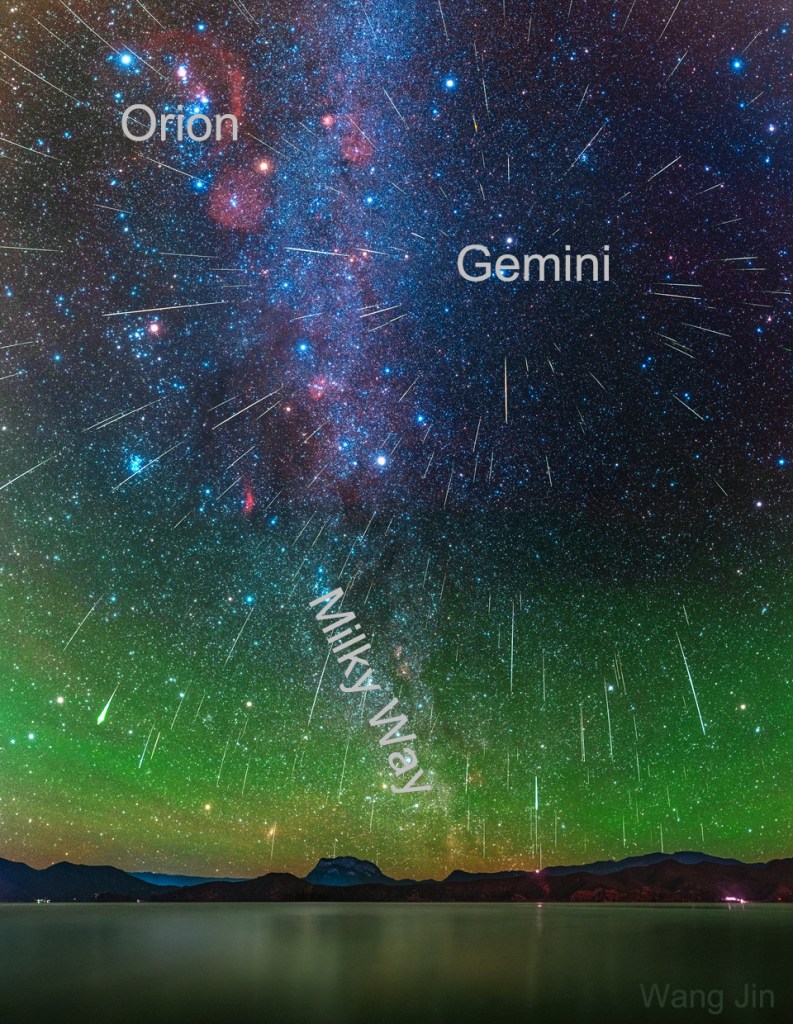 Explanation: Where are all of these meteors coming from? In terms of direction on the sky, the pointed answer is the constellation of Gemini. That is why the major meteor shower in December is known as the Geminids — because shower meteors all appear to come from a radiant toward Gemini. Three dimensionally, however, sand-sized debris expelled from the unusual asteroid 3200 Phaethon follows a well-defined orbit about our Sun, and the part of the orbit that approaches Earth is superposed in front of the constellation of Gemini. Therefore, when Earth crosses this orbit, the radiant point of falling debris appears in Gemini. Featured here, a composite of many images taken during the 2020 Geminids meteor shower shows over 200 bright meteors that streaked through the sky during the night December 14. The best meteor shower in November, the Leonids, peaks tonight and tomorrow. Unfortunately, this year, dim meteors during the early-morning peak will be hard to see against a sky lit by a bright gibbous moon. Still, a few bright Leonid meteors should be visible each hour.