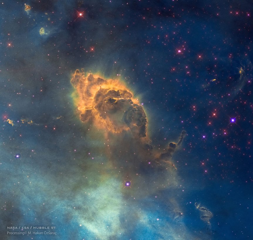 Explanation: To some, it may look like a beehive. In reality, the featured image from the Hubble Space Telescope captures a cosmic pillar of dust, over two-light years long, inside of which is Herbig-Haro 666 — a young star emitting powerful jets. The structure lies within one of our galaxy’s largest star forming regions, the Carina Nebula, shining in southern skies at a distance of about 7,500 light-years. The pillar‘s layered outline are shaped by the winds and radiation of Carina’s young, hot, massive stars, some of which are still forming inside the nebula. A dust-penetrating view in infrared light better shows the two, narrow, energetic jets blasting outward from a still hidden infant star.