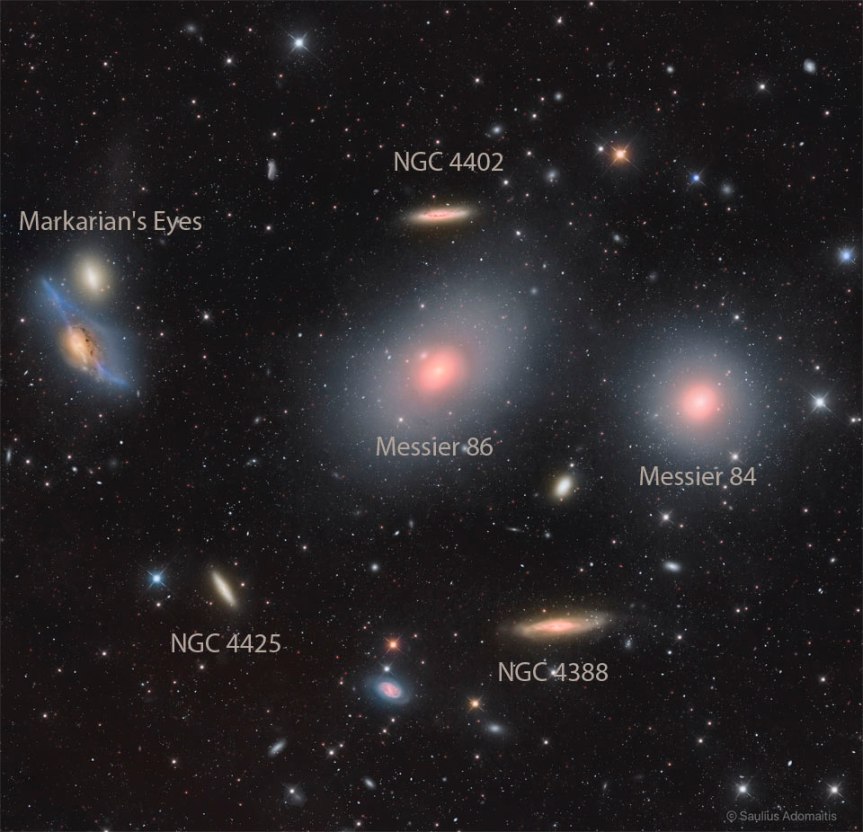 Explanation: The Virgo Cluster of Galaxies is the closest cluster of galaxies to our Milky Way Galaxy. The Virgo Cluster is so close that it spans more than 5 degrees on the sky – about 10 times the angle made by a full Moon. With its heart lying about 70 million light years distant, the Virgo Cluster is the nearest cluster of galaxies, contains over 2,000 galaxies, and has a noticeable gravitational pull on the galaxies of the Local Group of Galaxies surrounding our Milky Way Galaxy. The cluster contains not only galaxies filled with stars but also gas so hot it glows in X-rays. Motions of galaxies in and around clusters indicate that they contain more dark matter than any visible matter we can see. Pictured here, the heart of the Virgo Cluster includes bright Messier galaxies such as Markarian’s Eyes on the upper left, M86 just to the upper right of center, M84 on the far right, as well as spiral galaxy NGC 4388 at the bottom right.