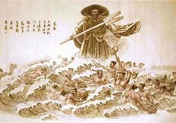 The Huainanzi tells an ancient story about how the four pillars that support the sky crumbled inexplicably. Other sources have tried to explain the cause, i.e. the battle between Gong Gong and Zhuanxu or Zhurong. Unable to accept his defeat, Gong Gong deliberately banged his head onto Mount Buzhou (不周山) which was one of the four pillars. Half of the sky fell which created a gaping hole and the earth itself was cracked; the earth’s axis mundi was tilted into the southeast while the sky rose into the northwest. This is said to be the reason why the western region of China is higher than the eastern and that most of its rivers flow towards the southeast. This same explanation is applied to the sun, moon, and stars which moved into the northwest. A wildfire burnt the forests and led the wild animals to run amok and attack the innocent peoples, while the water which was coming out from the earth’s crack didn’t seem to be slowing down.[32]