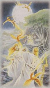 Five robed magicians (some men, some women) are battling each other with their wands. Flashes of magickal energy come from the wands, as the magicians either defend themselves or attack others. These magicians represent two types of people in the world: those who are overly ambitious and jealous of what others accomplish, and those who must learn to defend themselves against such attacks by others. Jealous people often attack those who have worked hard and gained positive things from their efforts; unfortunately it is a common human failing. Life is difficult enough (symbolized by the rocky landscape and twisted tree roots), without complicating it with unnecessary battles brought on by misunderstandings, jealousy, and twisted ethics. Only a cool head, spiritual guidance, and resistance to foes will help balanced person win the day. Tiny Air dragons dart above them, their fiery breath intermingling with flashes of energy. They represent the astral guardians who try to bring peace to such a situation.