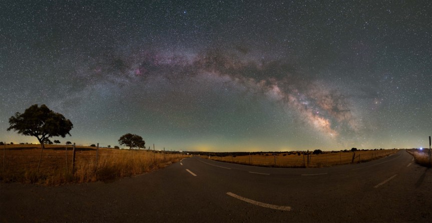Explanation: At night you can follow this road as it passes through the Dark Sky Alqueva reserve not too far from Alentejo, Portugal. Or you could stop, look up, and follow the Milky Way through the sky. Both stretch from horizon to horizon in this 180 degree panorama recorded on June 3. Our galaxy’s name, the Milky Way, does refer to its appearance as a milky path in the sky. The word galaxy itself derives from the Greek for milk. From our fair planet the arc of the Milky Way is most easily visible on moonless nights from dark sky areas, though not quite so bright or colorful as in this image. The glowing celestial band is due to the collective light of myriad stars along the galactic plane too faint to be distinguished individually. The diffuse starlight is cut by dark swaths of the galaxy’s obscuring interstellar dust clouds. Standing above the Milky Way arc near the top of this panoramic nightscape is bright star Vega, with the galaxy’s central bulge near the horizon at the right.