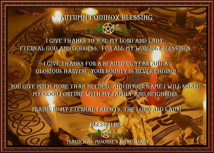 Use a White and Black candle, placed side by side, for this ritual. Breathe in the glow that comes from the equal balance of day and night. Decorate your sacred space with fruits and grain and harvest leaves as you slowly speak this verse: