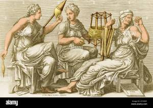 The Moirae, also known as the Fates “O Fates of Life, I ask your aid. To clear my path and set me free.” (Prayer to the Fates)The Greek Goddess of Fate is a daughter of Nyx, Goddess of the Night. In Her singular form, the Goddess of Fate is called Moira; and in Her triple form She becomes three sisters known as the Moirae. The Moirae are: Klotho the Spinner, who spins the thread of a person’s life; Lachesis the Measurer, who decides how much time is to be allowed each person, and Atropos the Cutter, who cuts the thread when you are supposed to die. The name ‘Moira’ actually means ‘part‘ and in fact, the triple form of the Fates mimics the triple moon phases and the three phases of life – maiden, mother and crone. Moira is known to the Romans as Fortuna, to the Scandinavians as Norns, to the Anglo-Saxons as Wyrd, and to the Celts as Morrigan. During the middle ages, the Fates became known as the Parcae.
