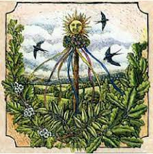 Symbols & decorations: maypole, strings of beads or flowers, ribbons, spring flowers, fires, fertility, growing things, ploughs, cauldrons of flowers, butterchurn, baskets, eggs
