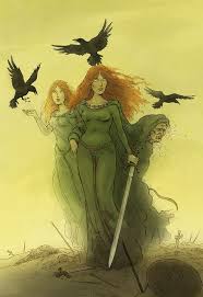 She appeared to the hero Cu Chulainn(son of the god Lugh) and offered her love to him. When he failed to recognize her and rejected her, she told him that she would hinder him when he was in battle. When Cu Chulainn was eventually killed, she settled on his shoulder in the form of a crow. Cu’s misfortune was that he never recognized the feminine power of sovereignty that she offered to him.